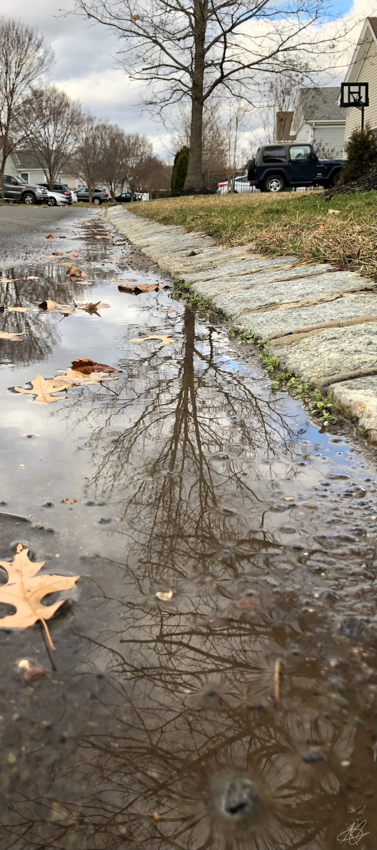 Let nature's beauty wash over you with this stunning photograph of a tree reflected in a rainy day puddle. Captured in perfect detail, its serene colors and shapes will add a beautiful calming touch to your wall.