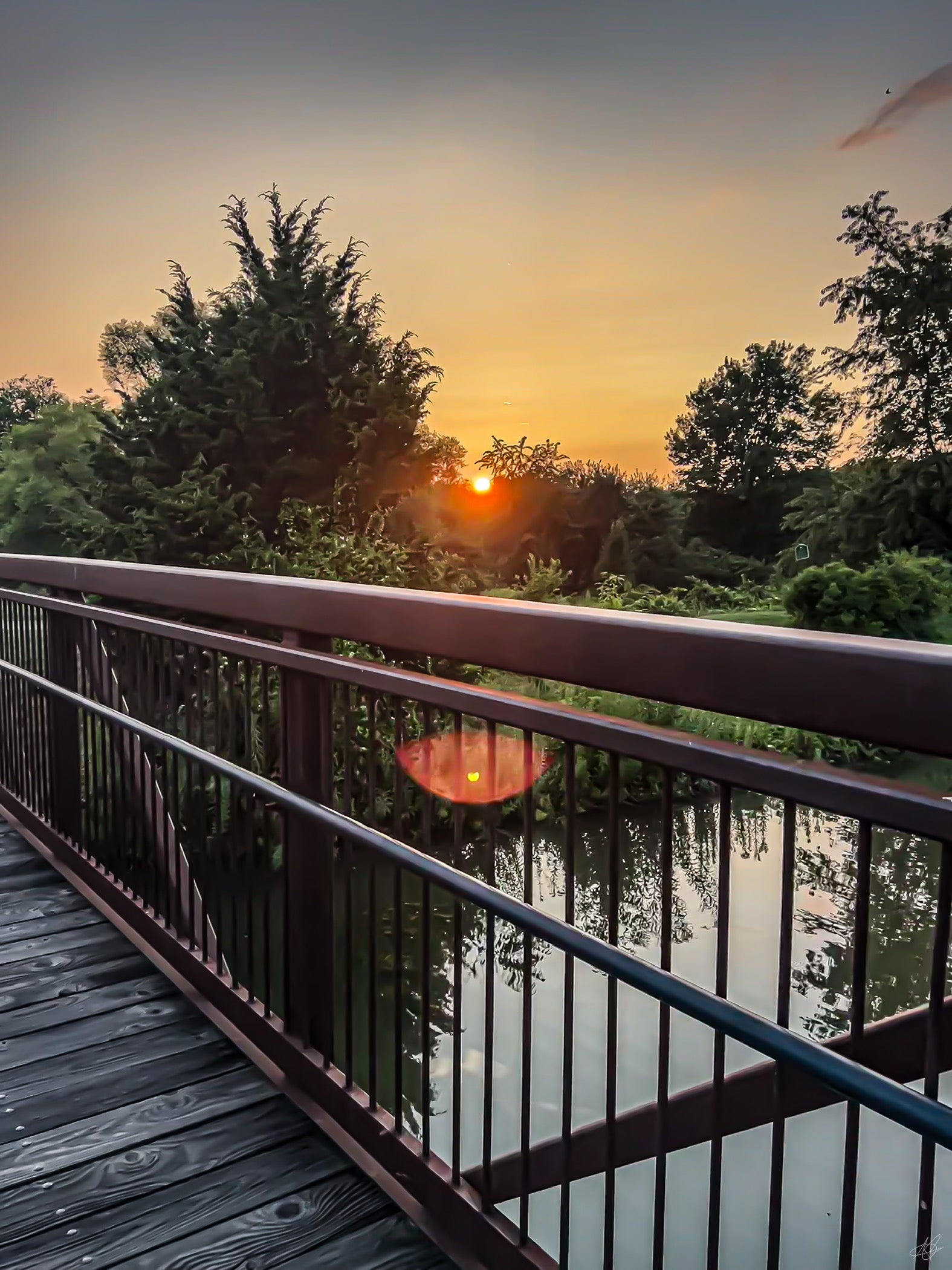 Experience the beauty and peacefulness of nature with this stunning photograph of a sunset through the trees and over a bridge. The radiant colors of the sky are sure to fill your home with serenity! Invite the calming energy of this piece into your space.