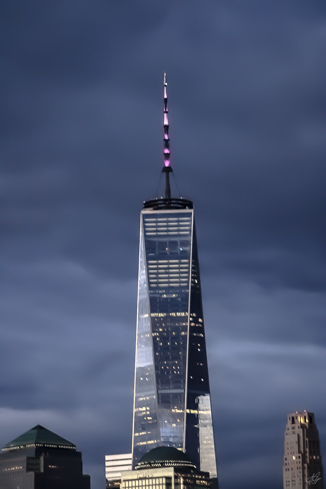 This stunning photograph of One World Trade Center during Blue Hour offers a unique view of NYC's iconic skyline. Enjoy the vibrant colors and the tranquil atmosphere of the moment, captured expertly in this eye-catching zoomed-in image!
