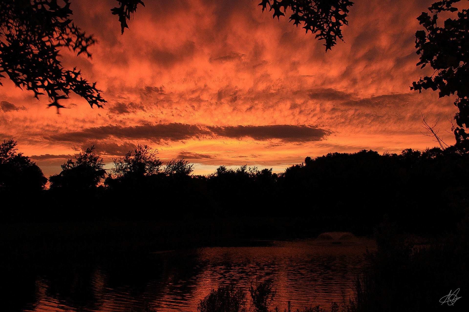 Dark Orange Hazy Sunset Over a Pond and the Trees